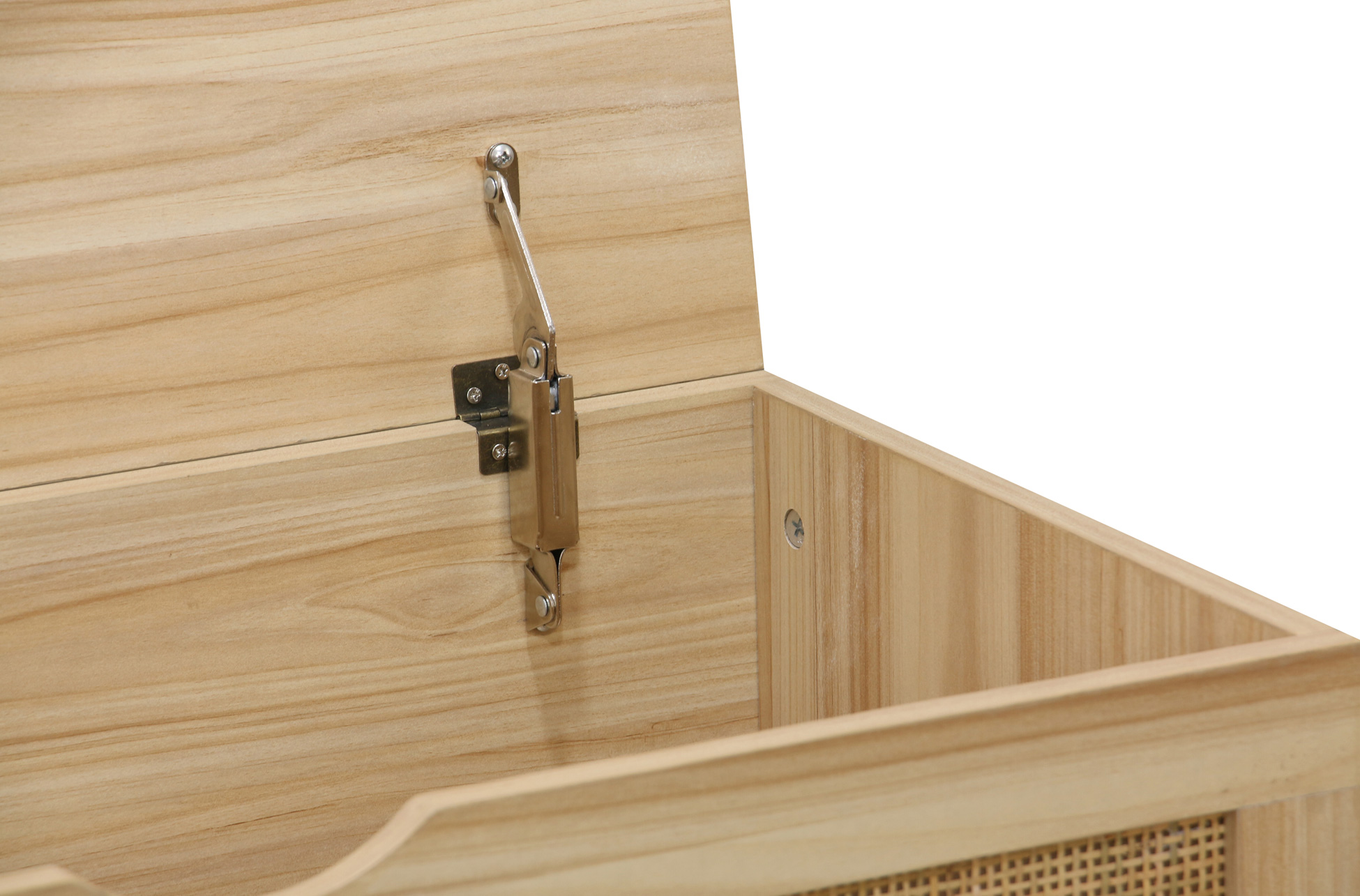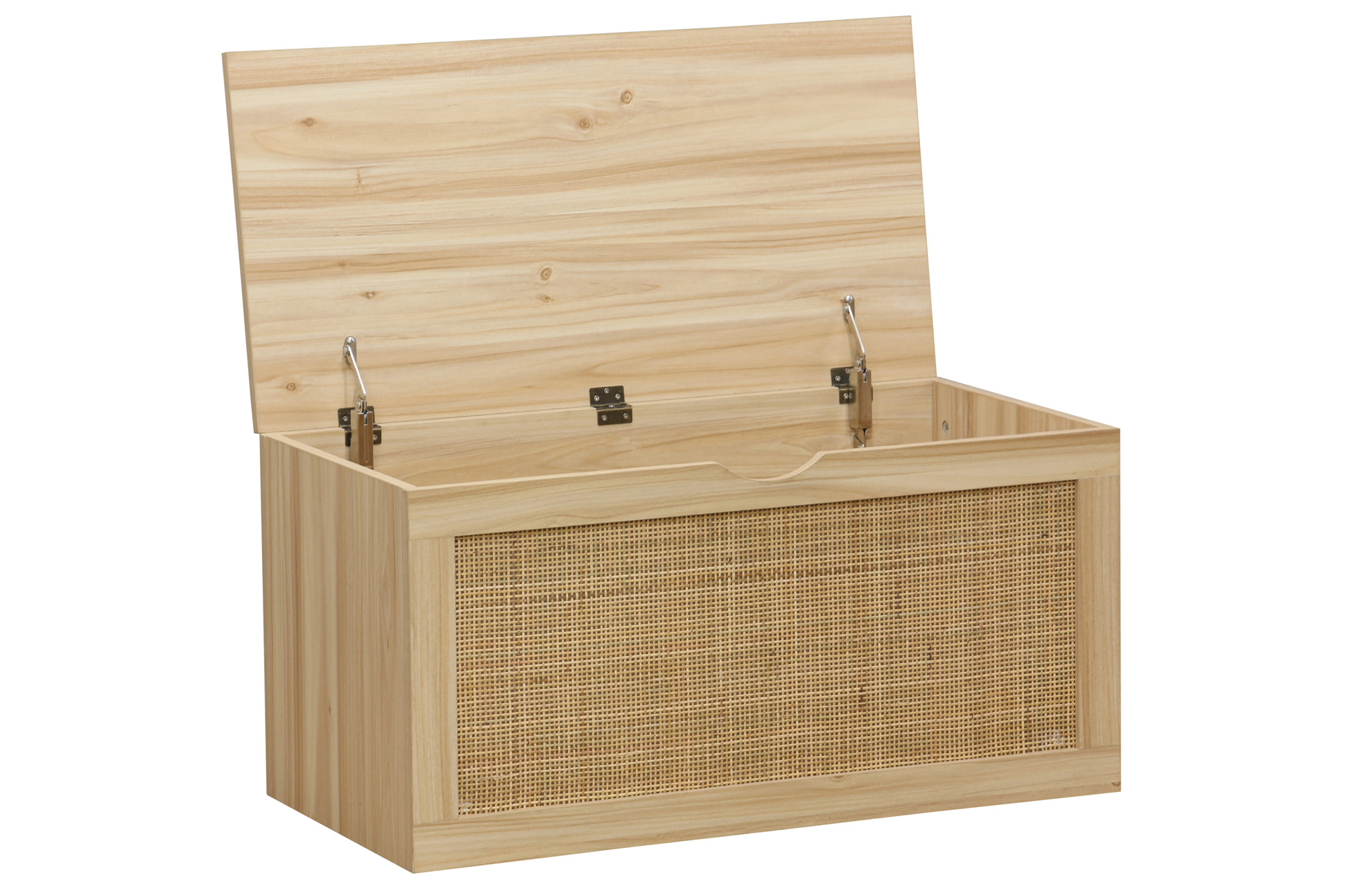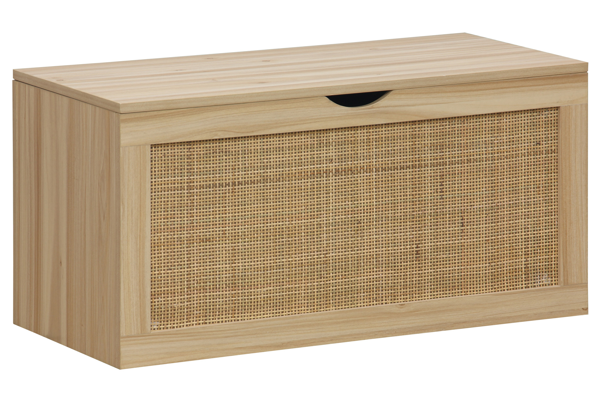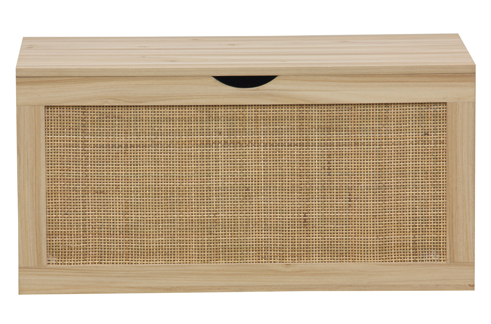 Baúl almacenaje. Apertura superior. Papel laminado pino. Frente decorativo en rattán. Medidas: 80 x 40 x 40 cm.