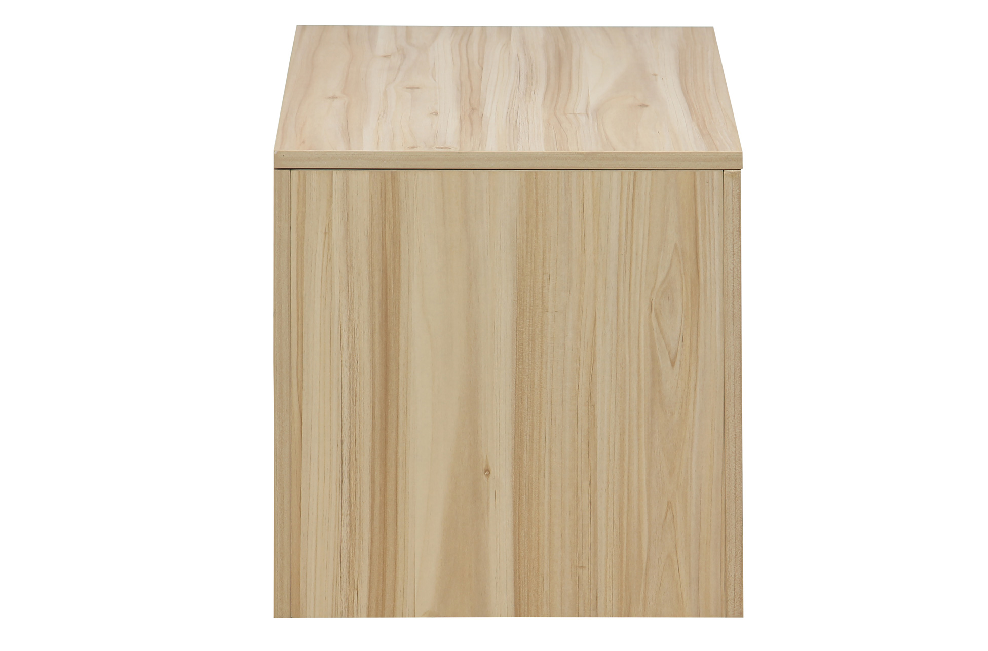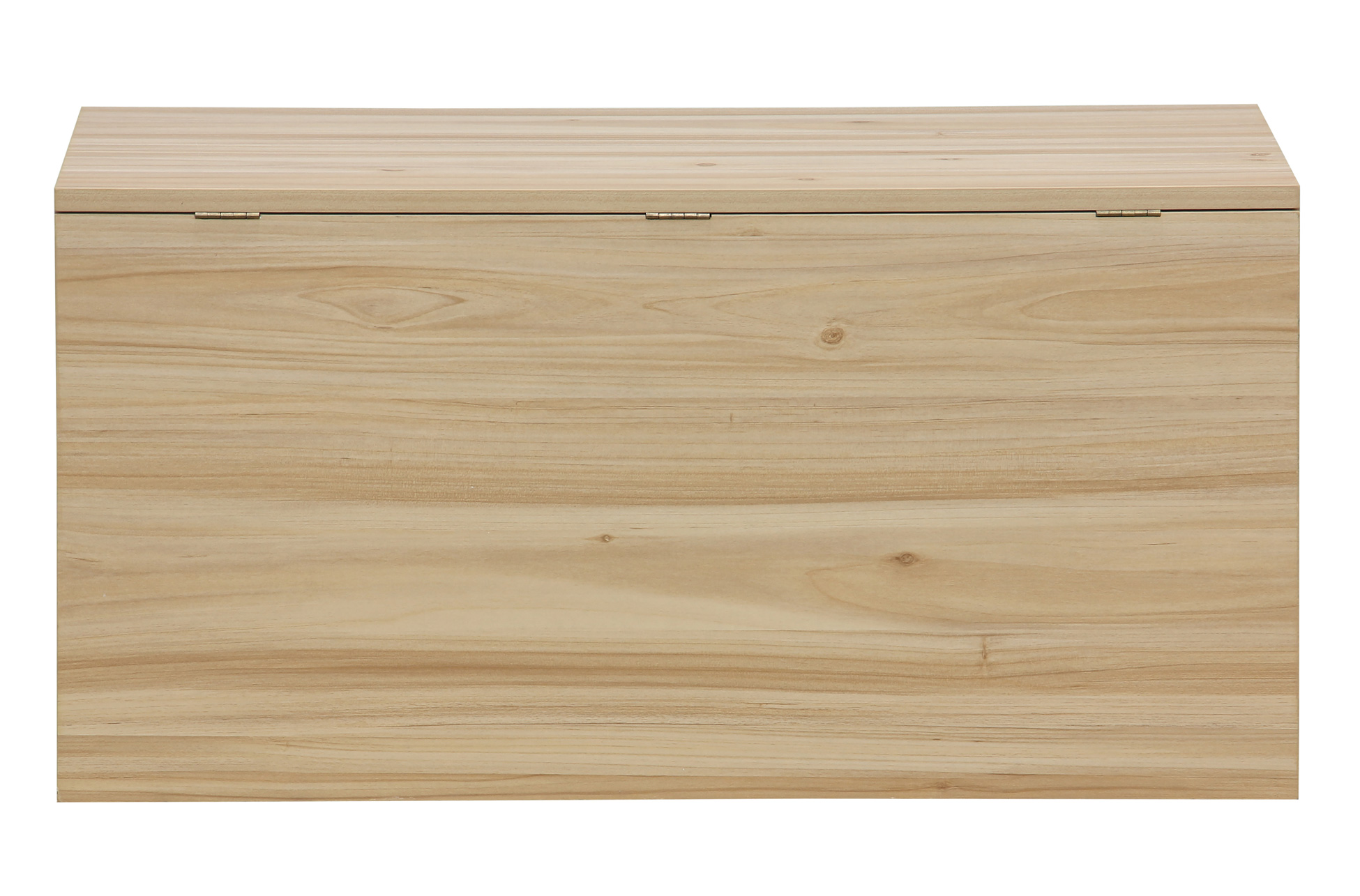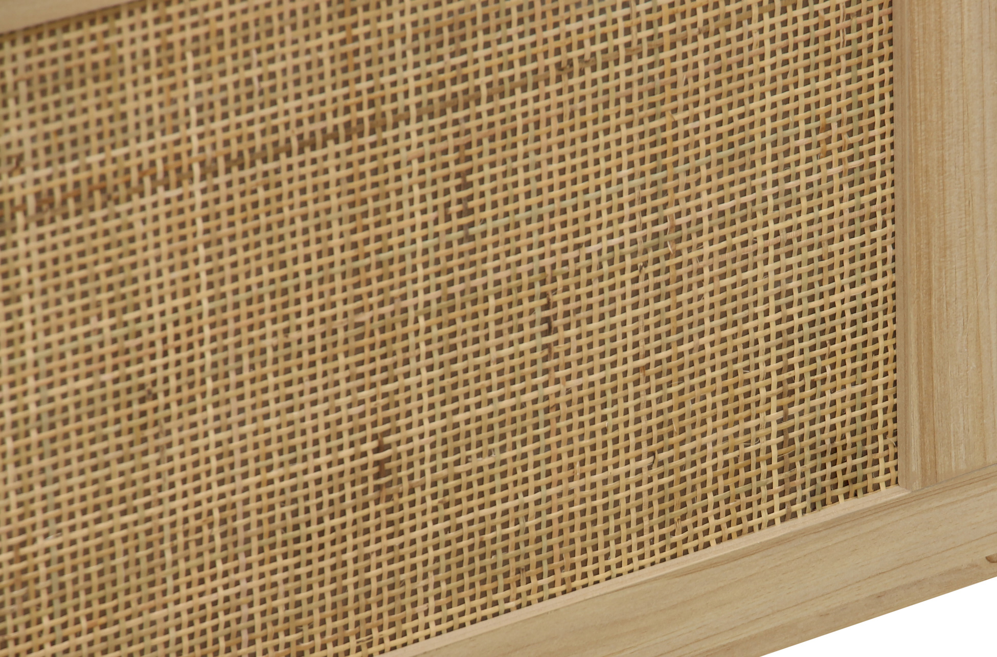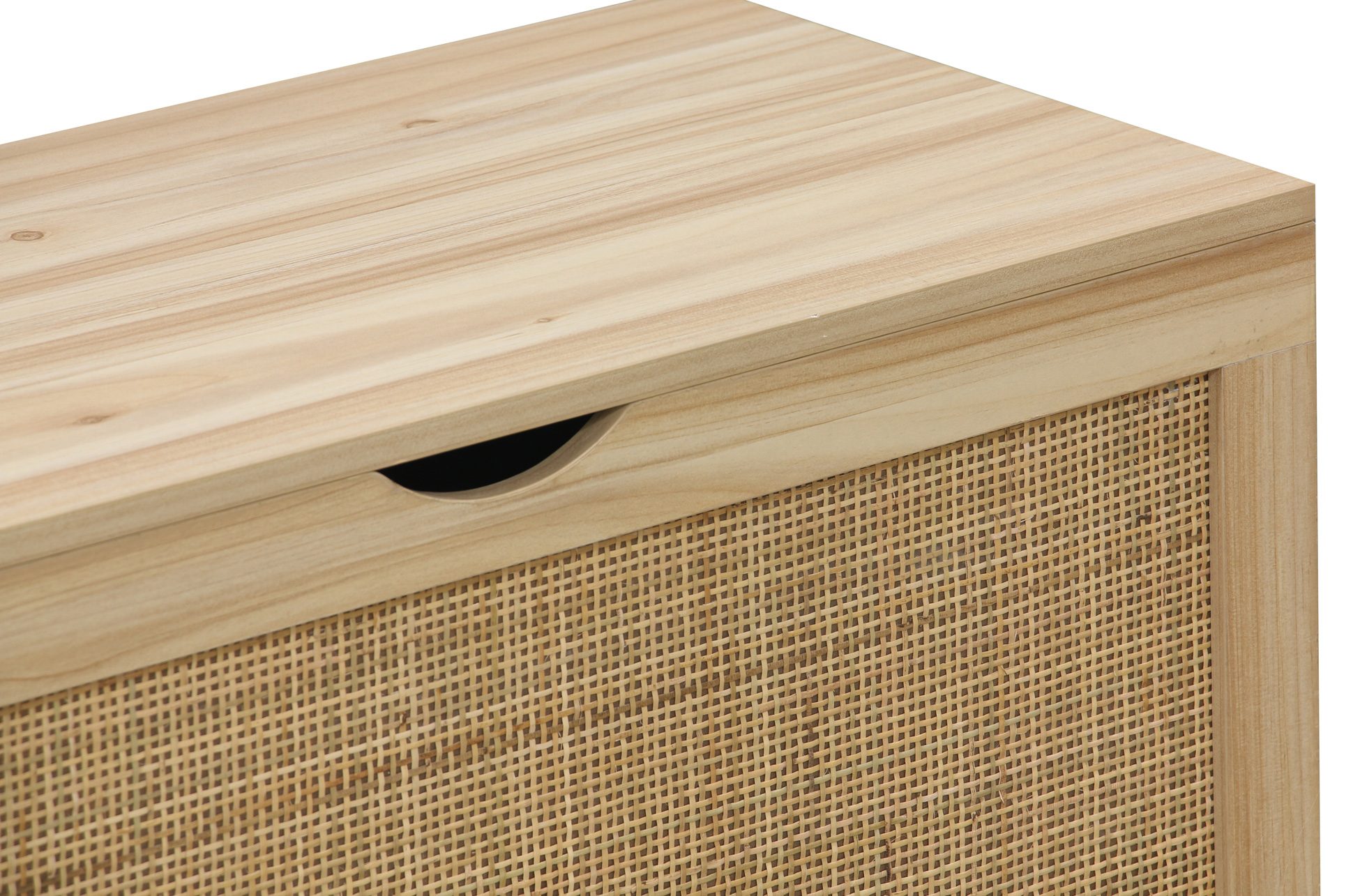 Baúl almacenaje. Apertura superior. Papel laminado pino. Frente decorativo en rattán. Medidas: 80 x 40 x 40 cm.