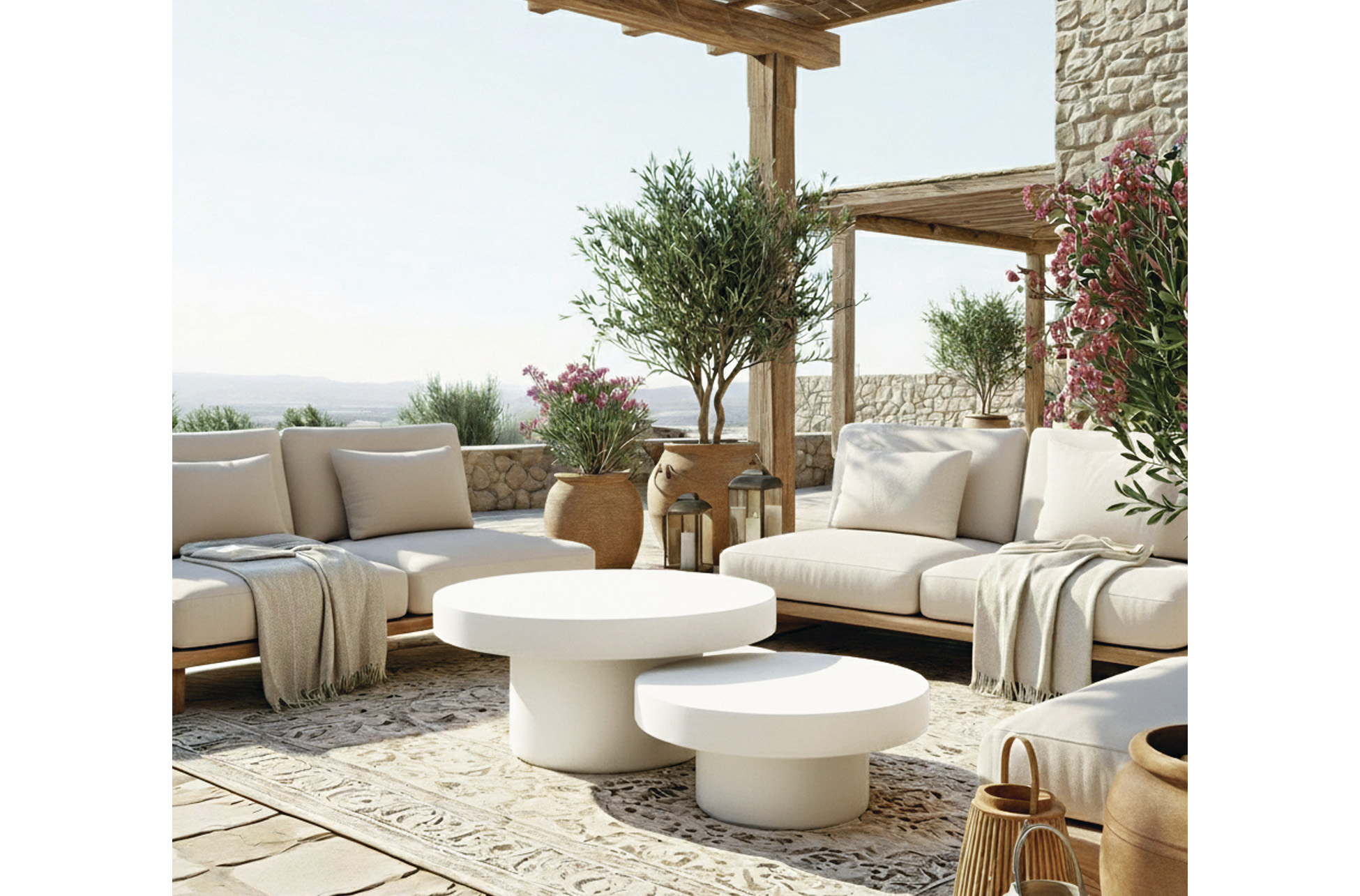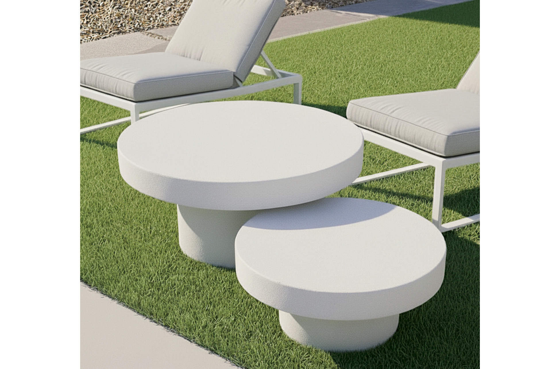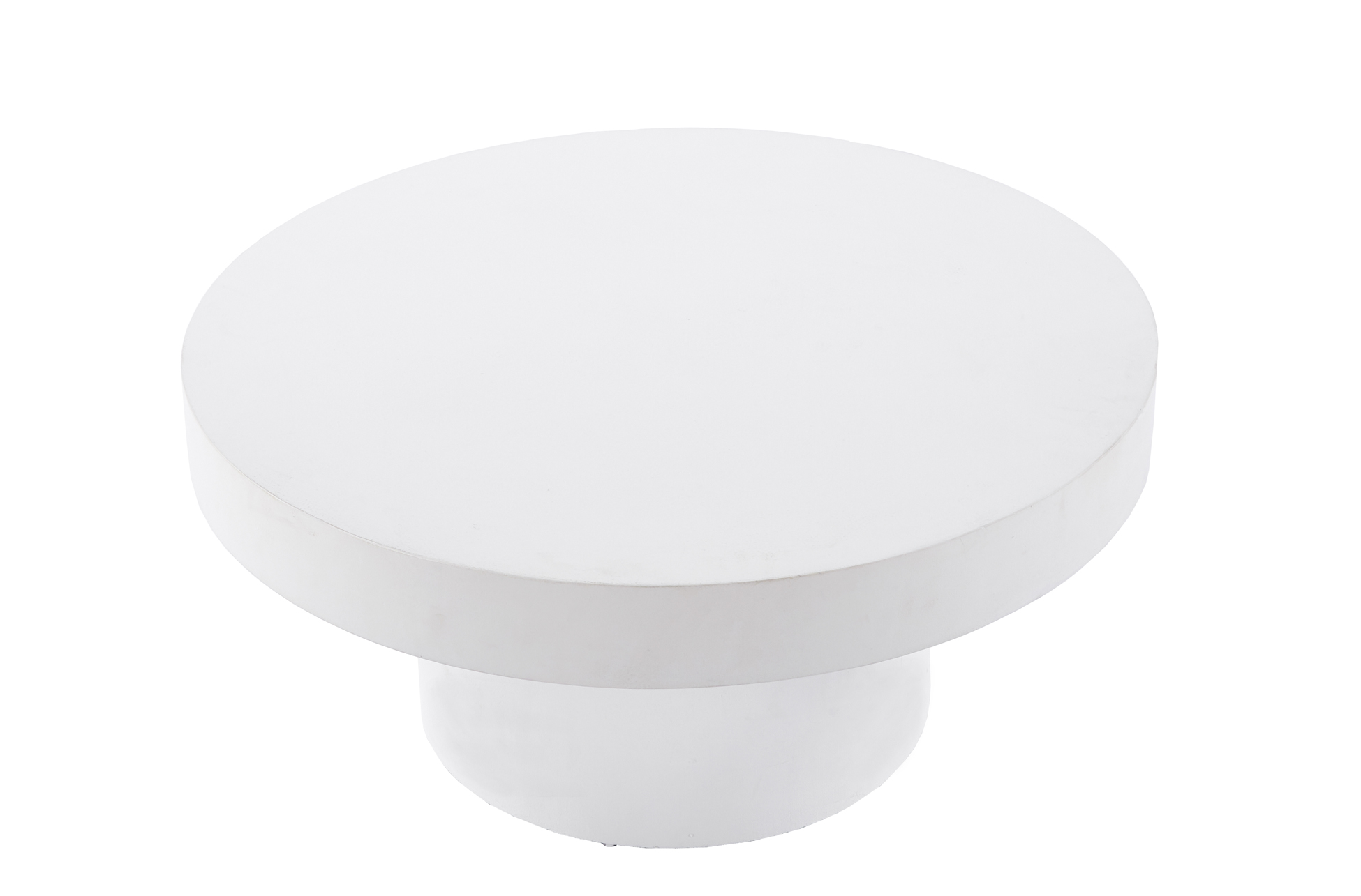 Mesa baja redonda exterior bajo techo / interior. Acabado en microcemento. Color blanco liso. Medidas : 66 x 66 x 30 cm.