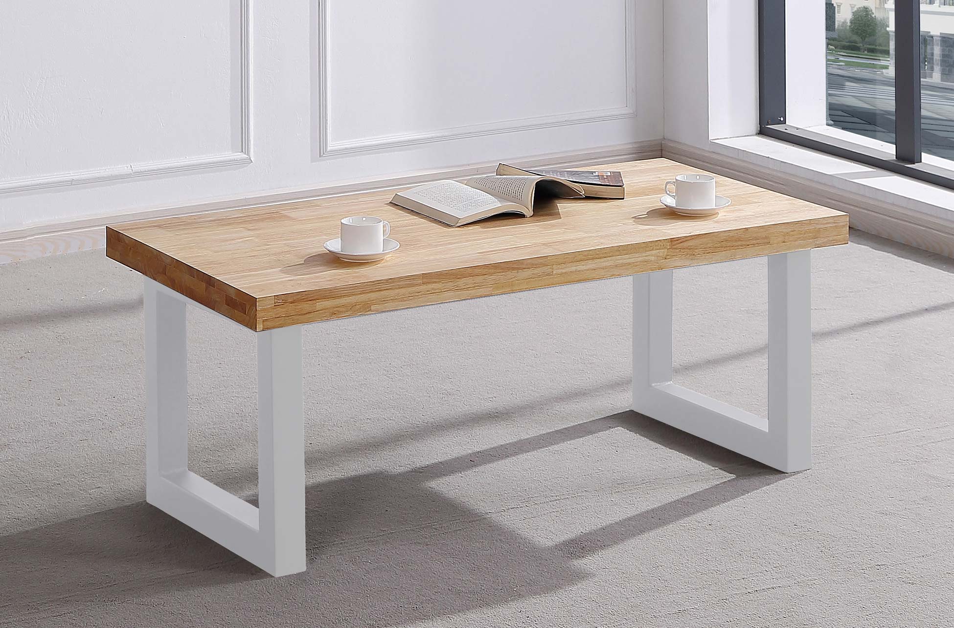 Mesa centro elevable Loft. Cajón interior portaobjetos. Tapa madera color roble nordish 54 mm. Patas metálicas color blanco. Medidas: 120 x 60 x 47,5 cm.