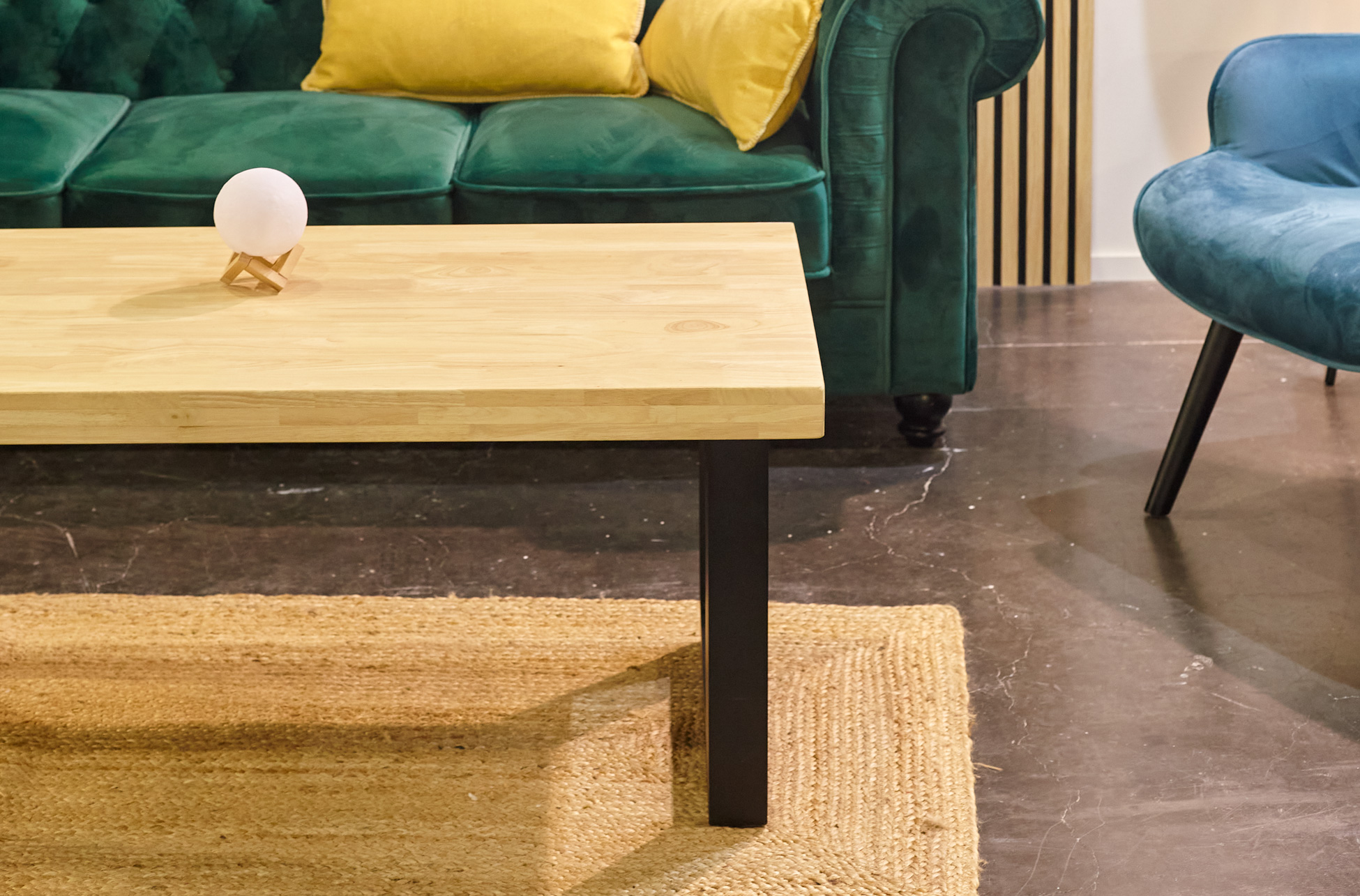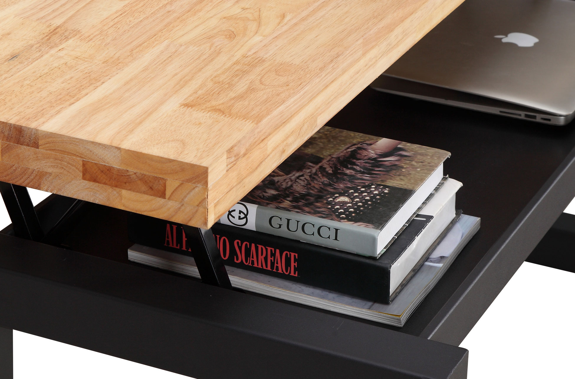 Mesa centro elevable Loft. Cajón interior portaobjetos. Tapa madera color roble salvaje 54 mm. Patas metálicas color negro. Medidas: 120 x 60 x 47,5 cm.