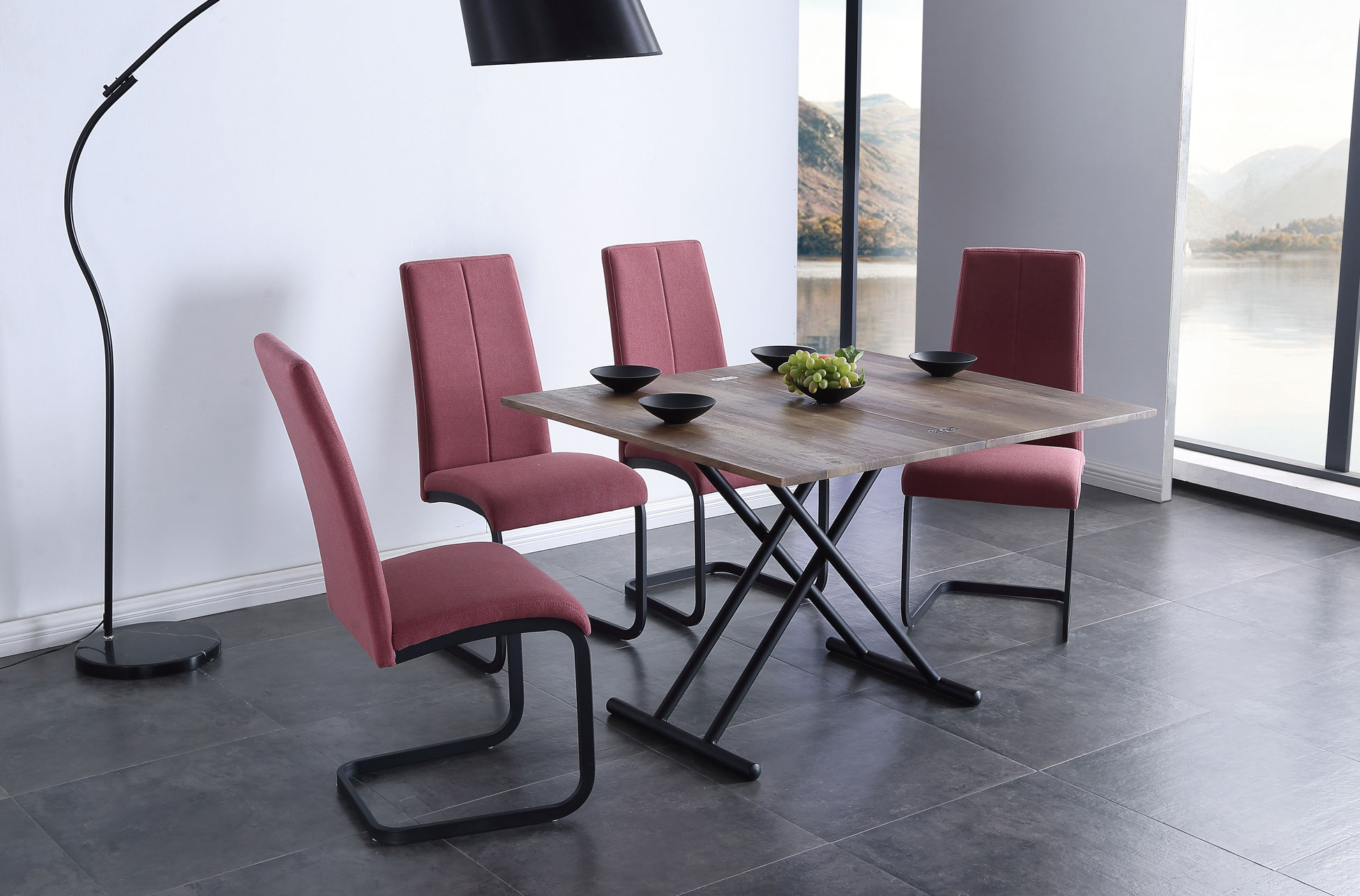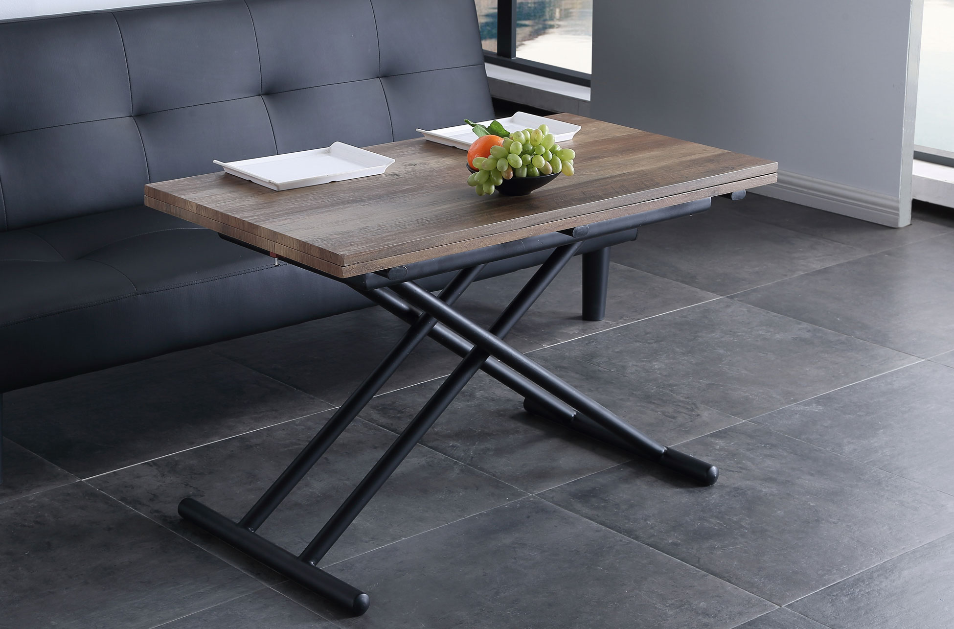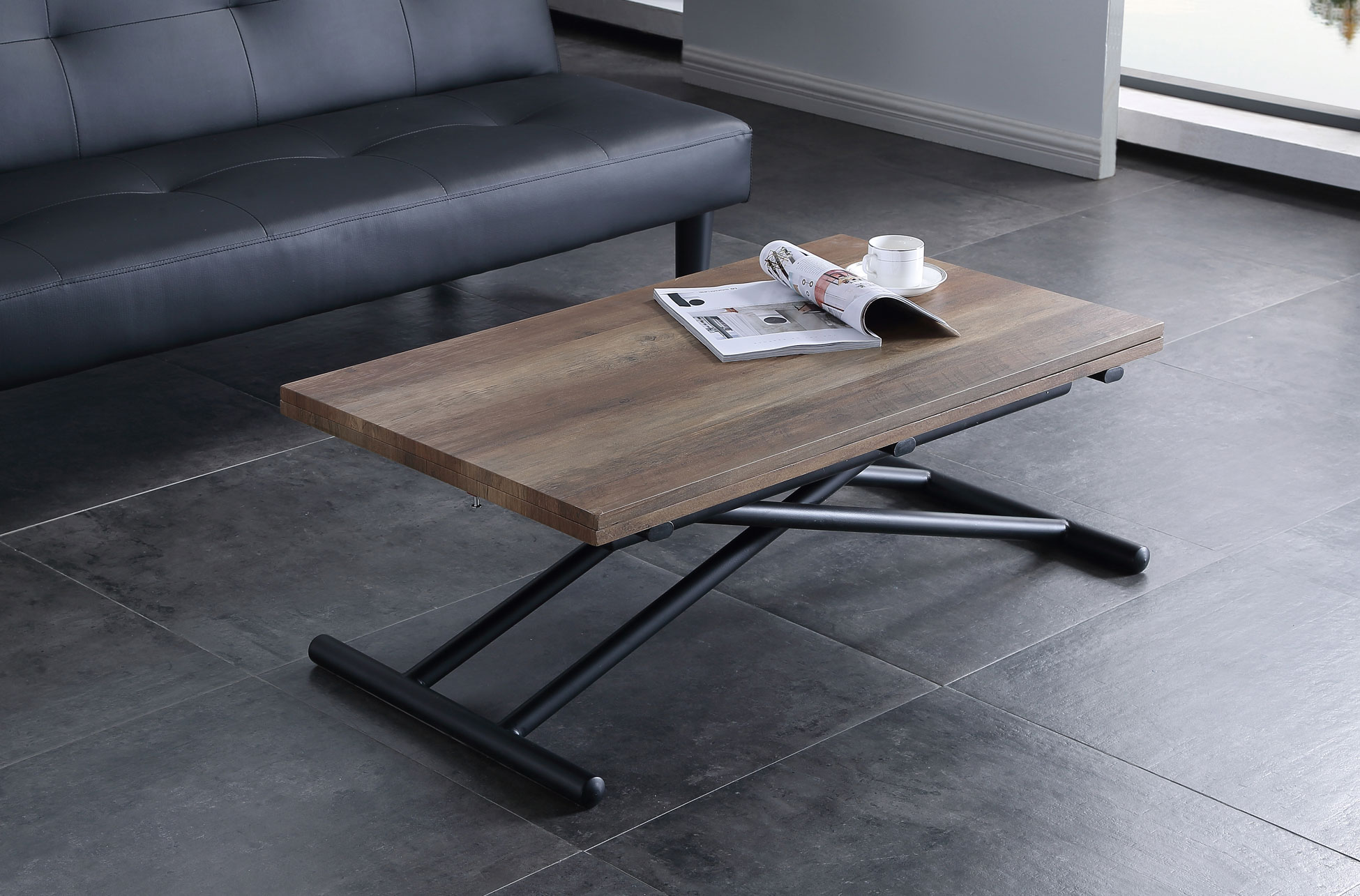 Mesa centro elevable y extensible Up – down. Elevable y convertible en mesa de comedor. Elevación mediante pulsador. Medida cerrada 100 x 50 x 49 – 76 cm. Medida abierta 100 x 100 x 49 – 76 cm. Tapa color nogal. Estructura metálica color negro.
