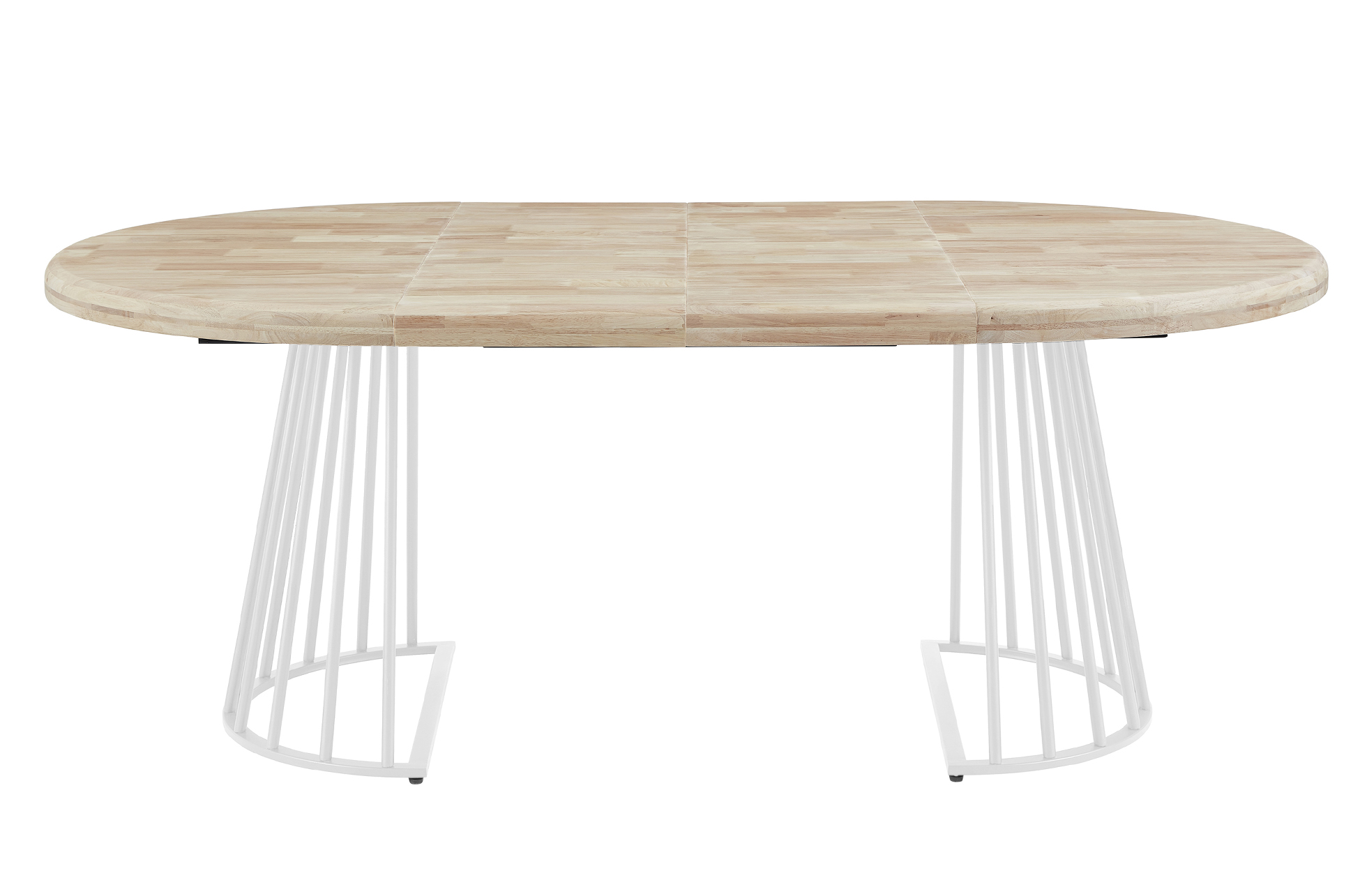 Tapa y extensibles en madera de roble. 2 extensibles individuales de 40 cm ancho. Extensible a 160 o 200 cm. Estructura metálica en color blanco. Medidas: 120 – 160 – 200 x 120 x 76 cm.