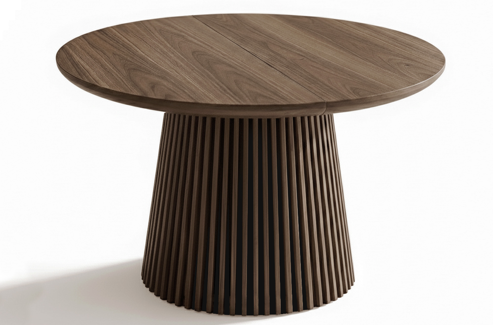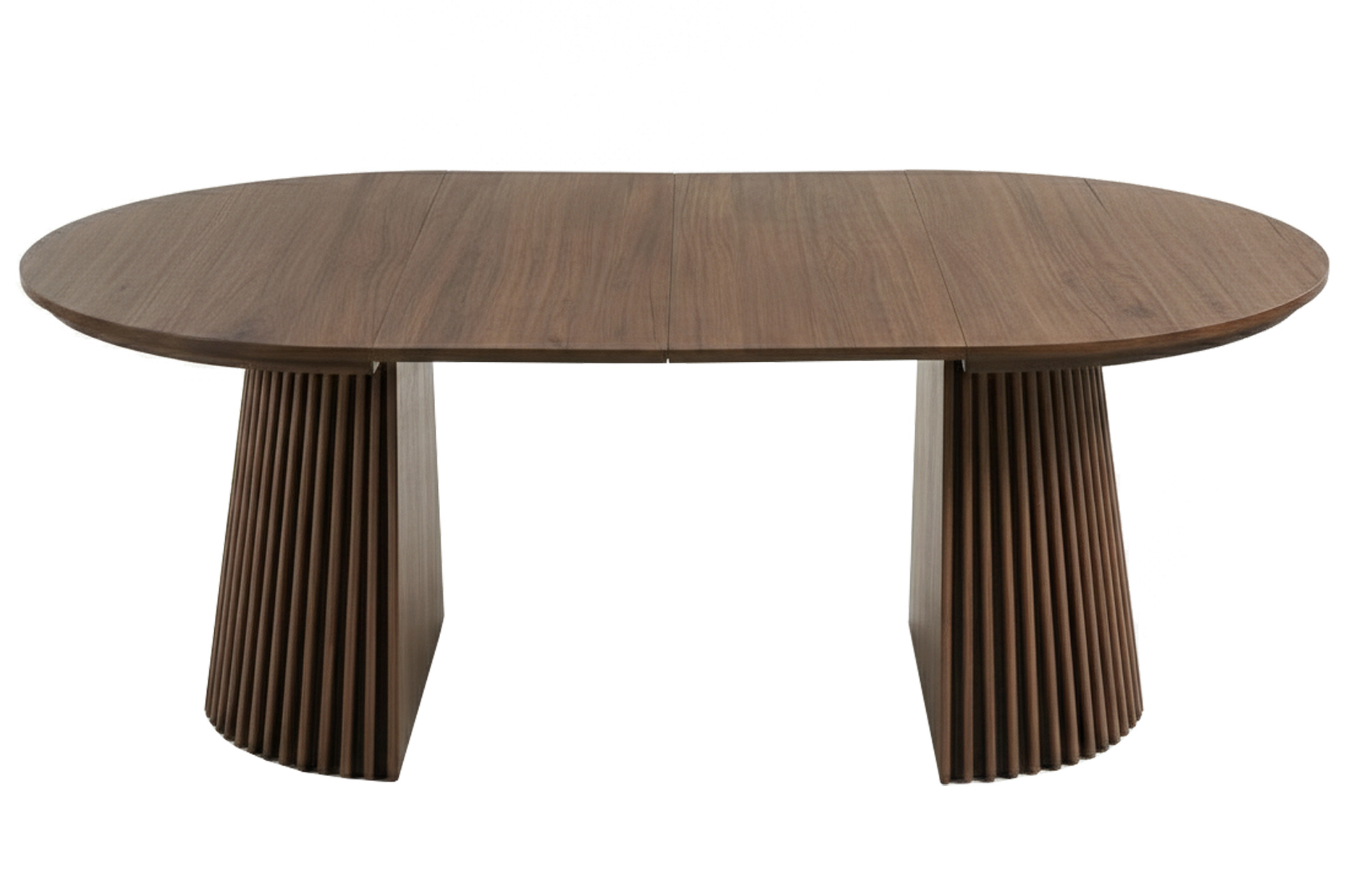 Tapa y extensibles en MDF y papel laminado. Extensible de 120 a 160 o 200 cm. 2 extensibles independientes 40 cm de ancho. Patas con forma de cono en palillería. Color nogal. Medidas: 120 – 160 – 200 x 120 x 75 cm.