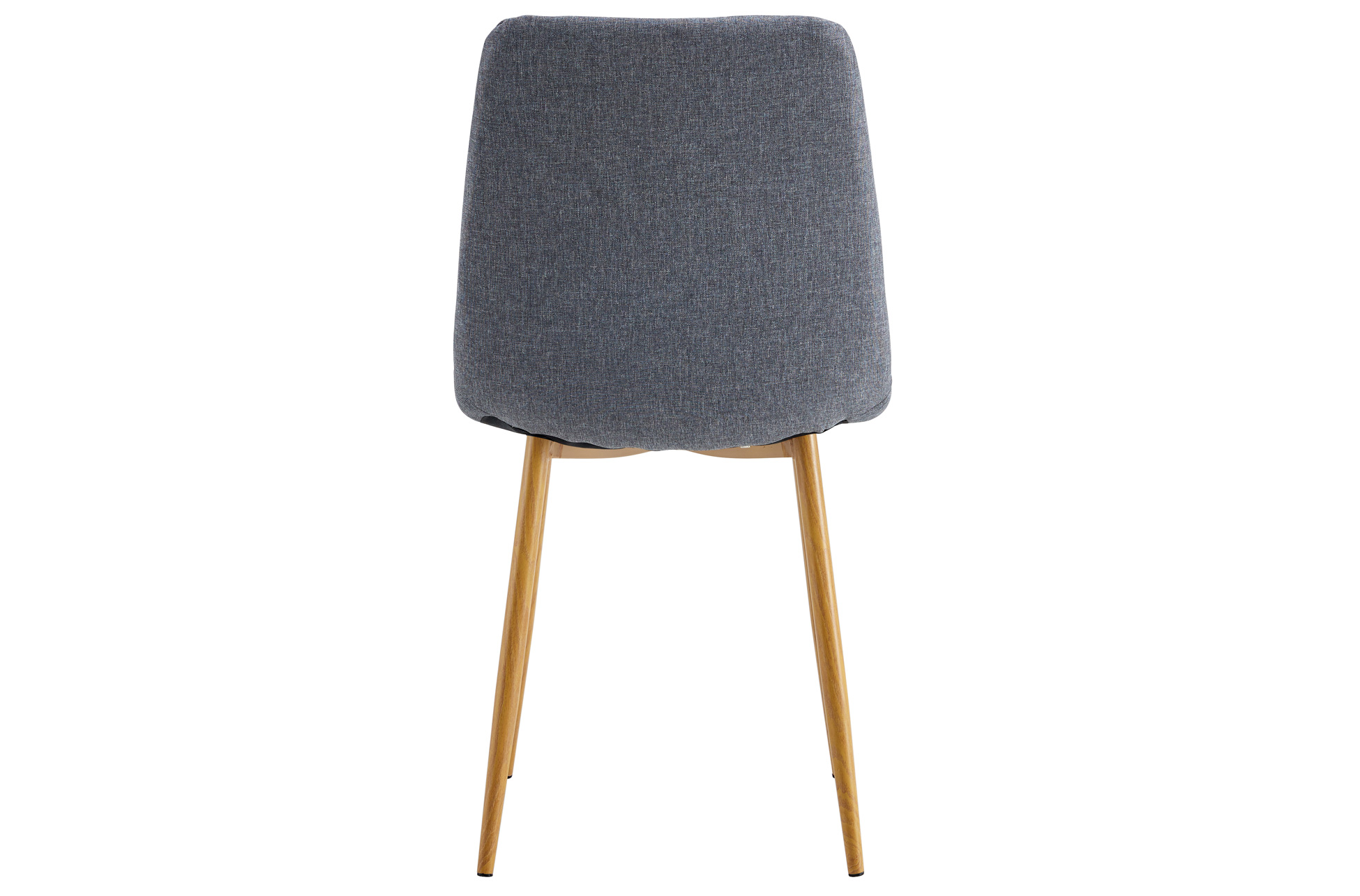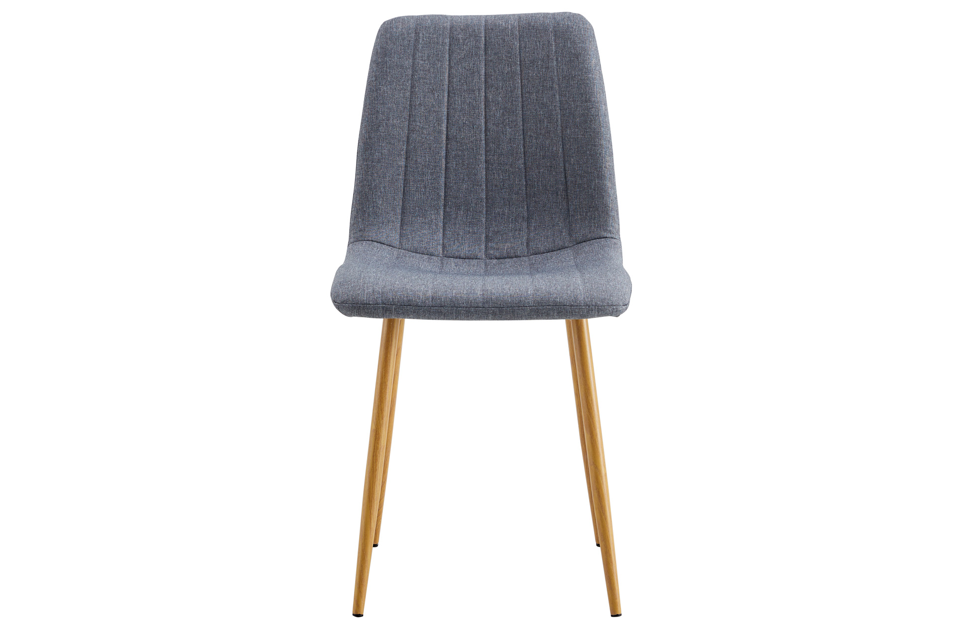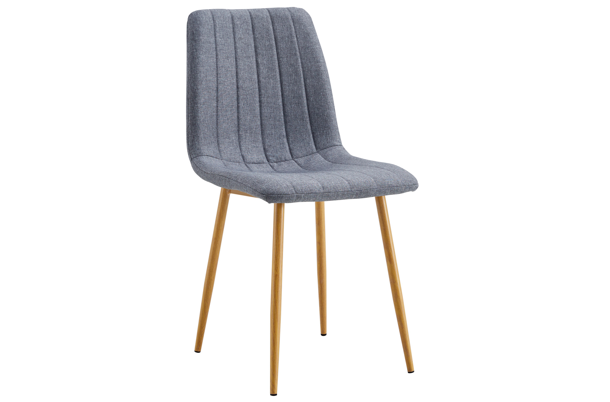 Silla de comedor tapizada. Tejido gris. Patas metálicas imitación madera oak. Costuras decorativas. Medidas: 44 x 55 x 87 cm.