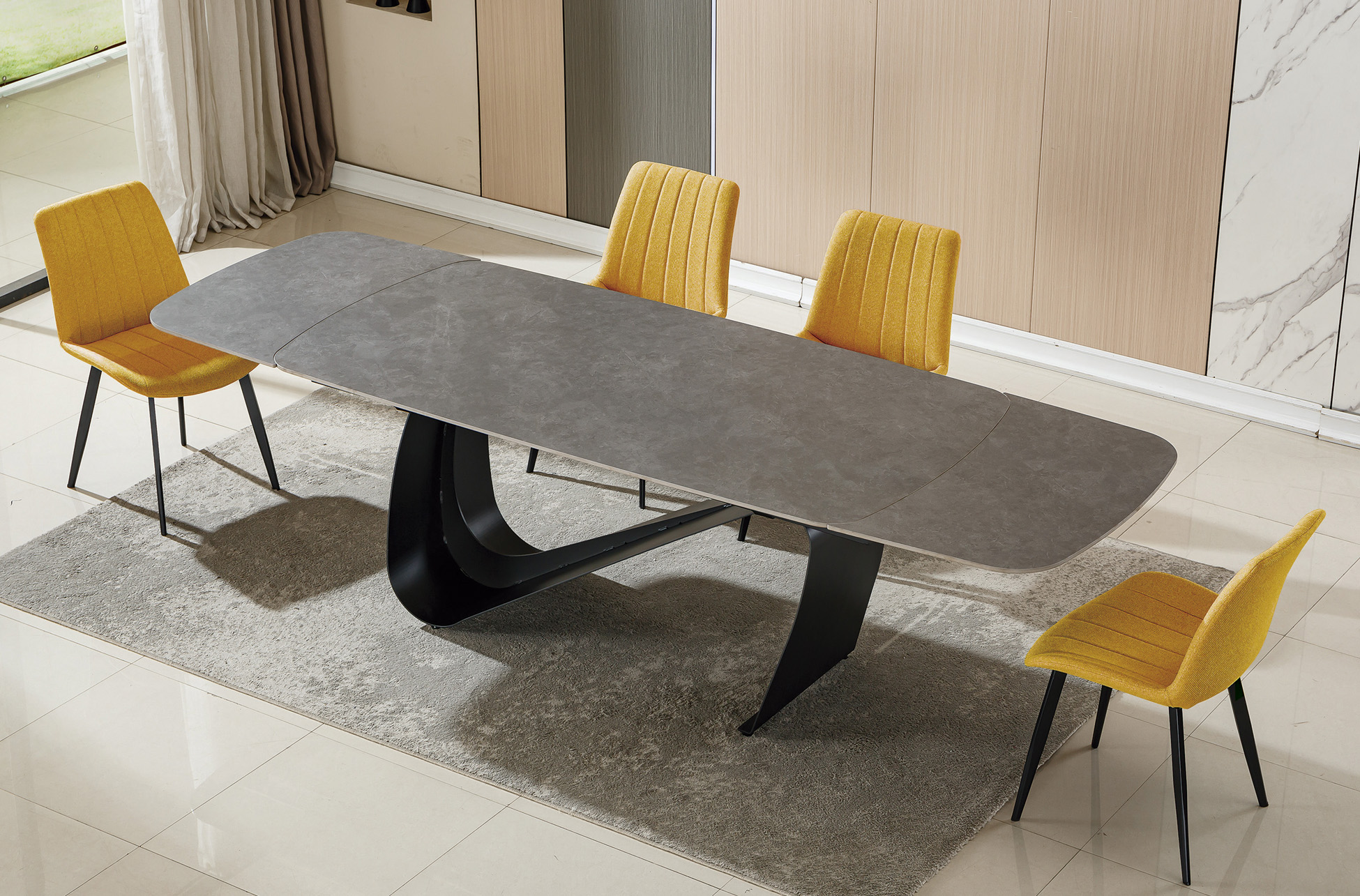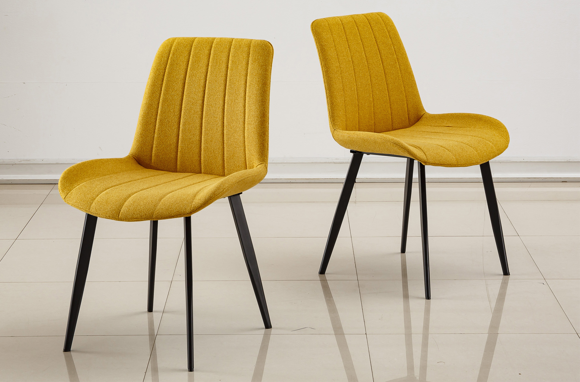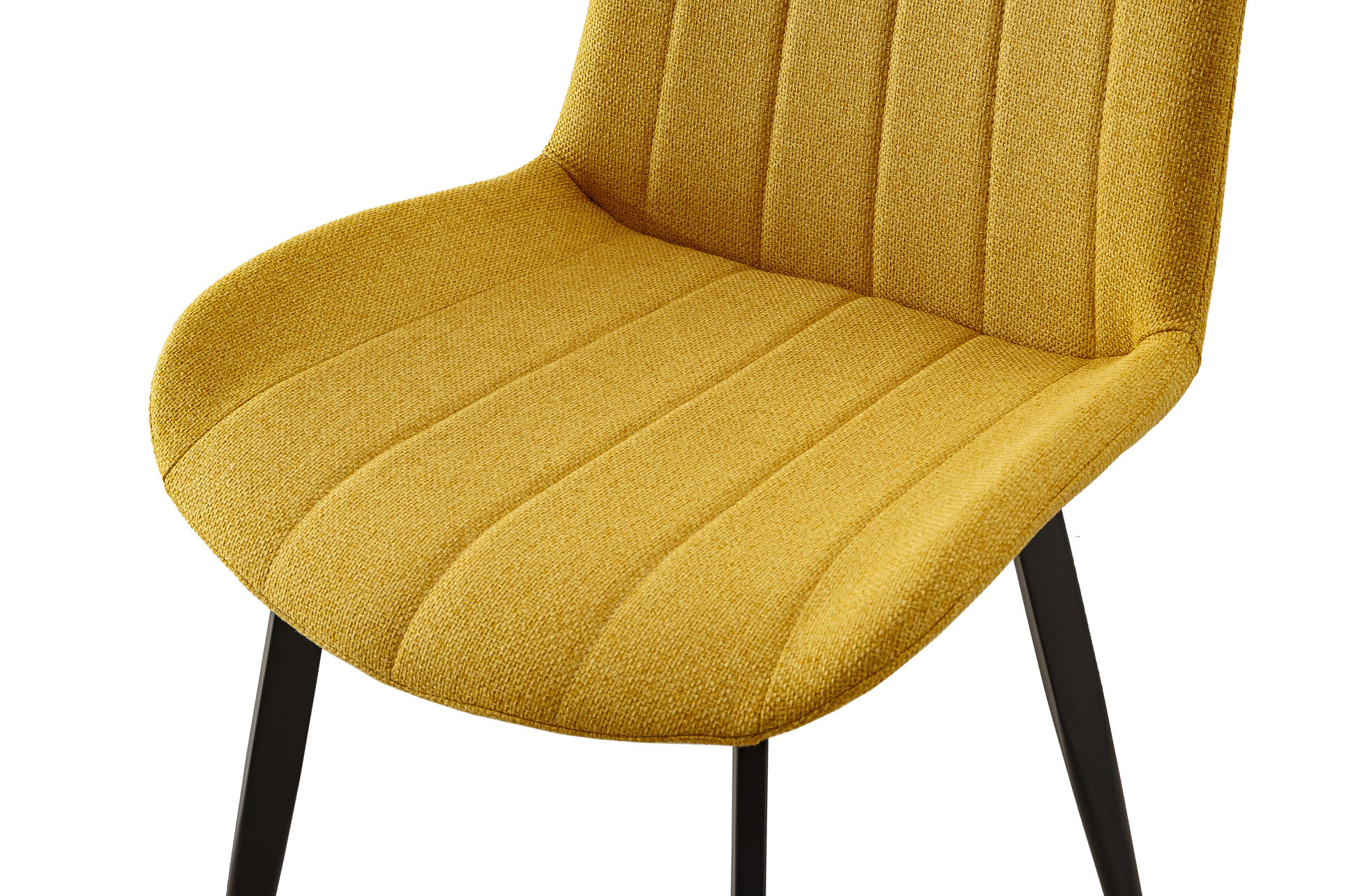 Silla comedor tapizada. Costuras decorativas líneas verticales. Estructura patas soldada en 1 pieza color negro. Tejido mostaza. Medidas : 51,5 x 59 x 83 cm.