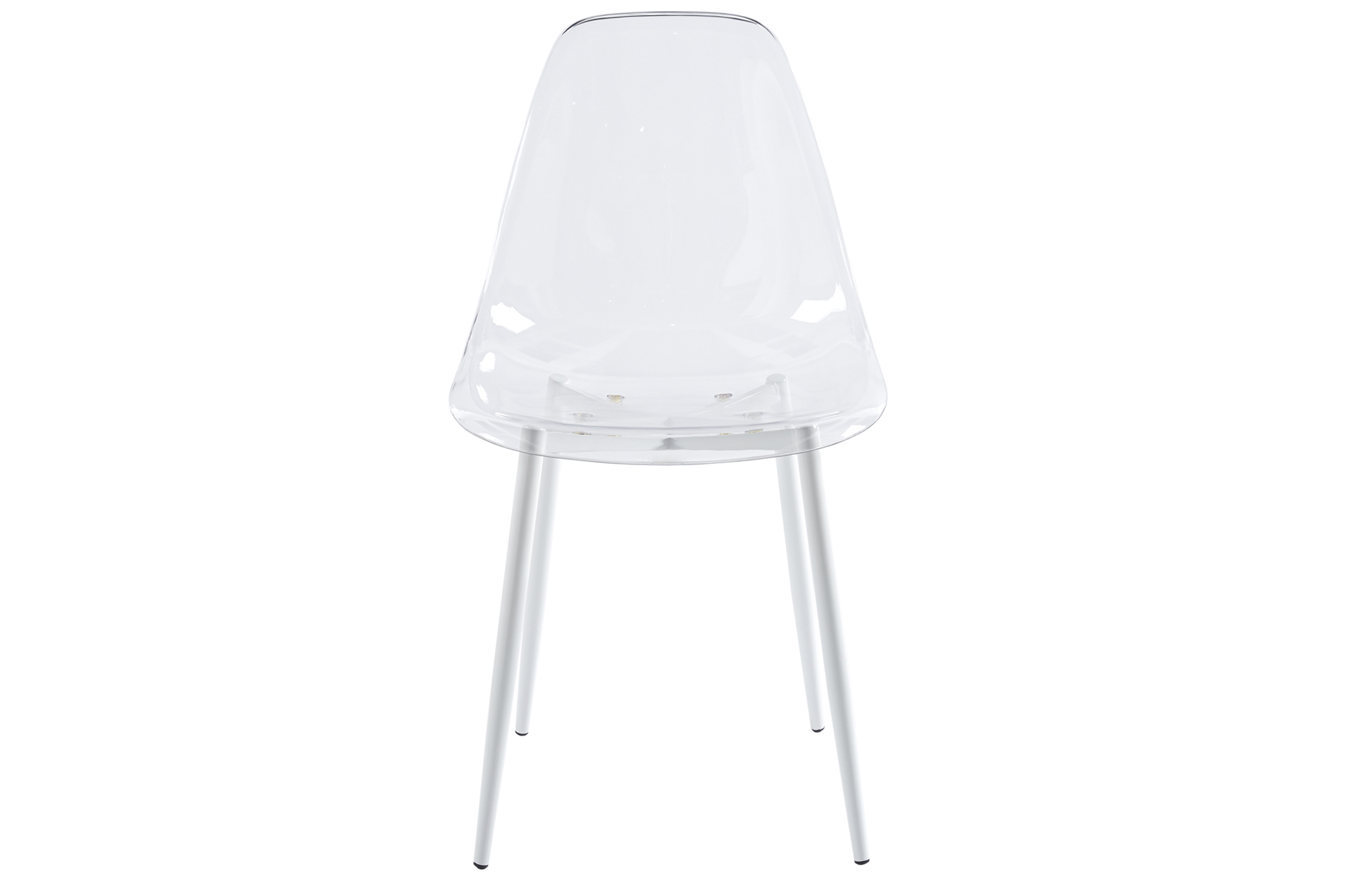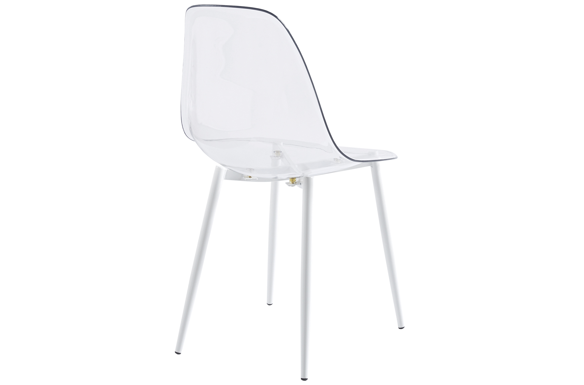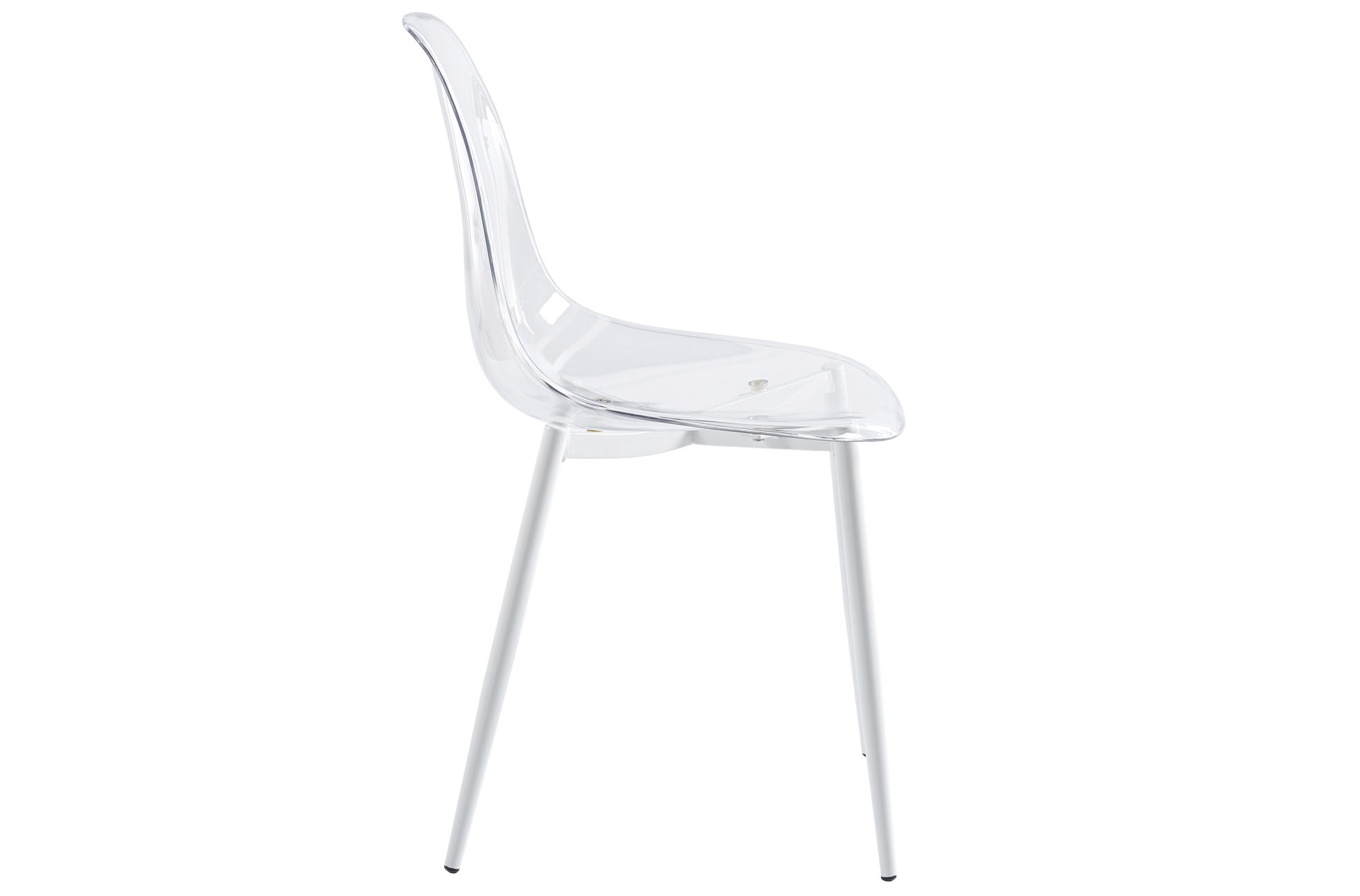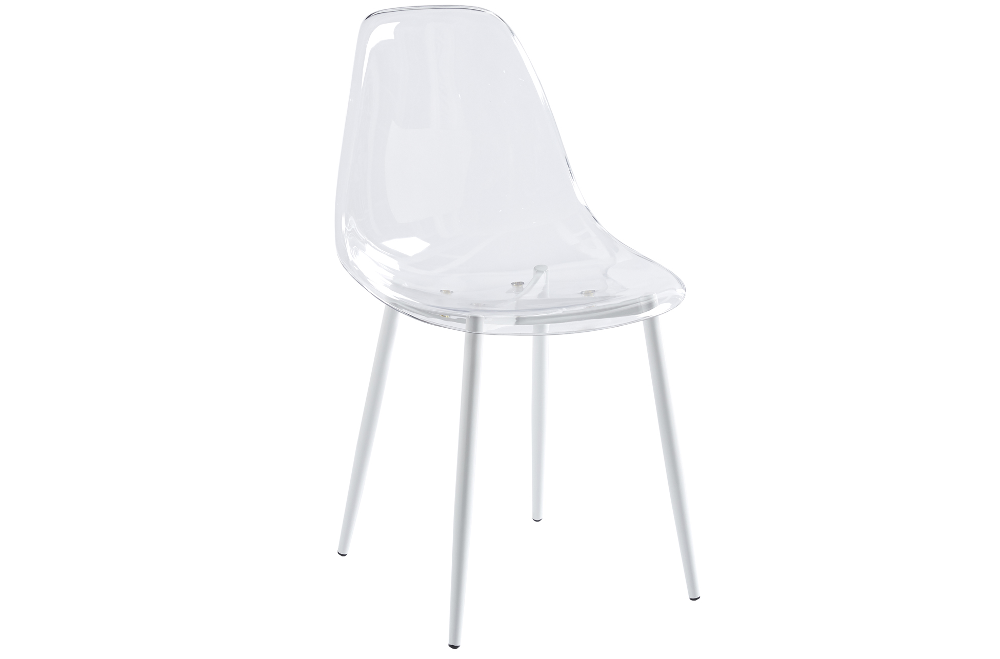 Carcasa de asiento y respaldo en PET transparente. Estructura de patas metálica en color blanco. Medidas: 46,5 x 50 x 85 cm.