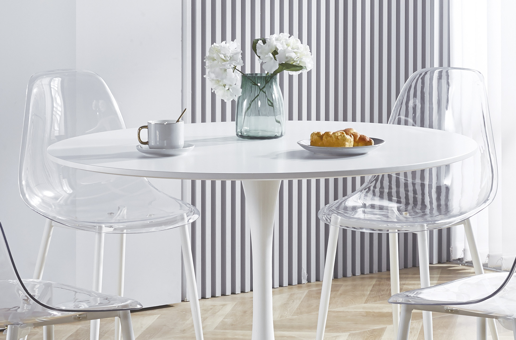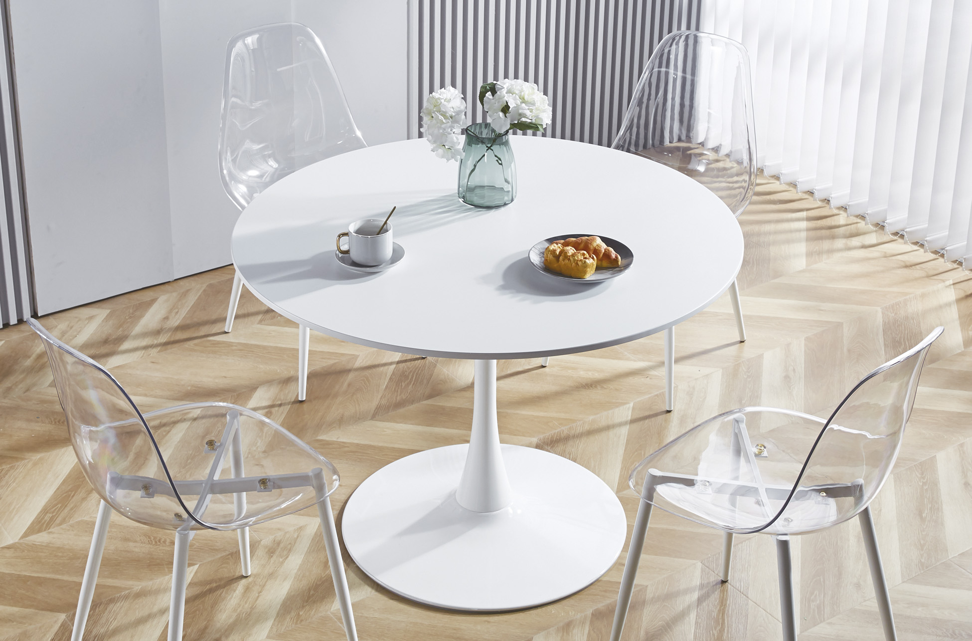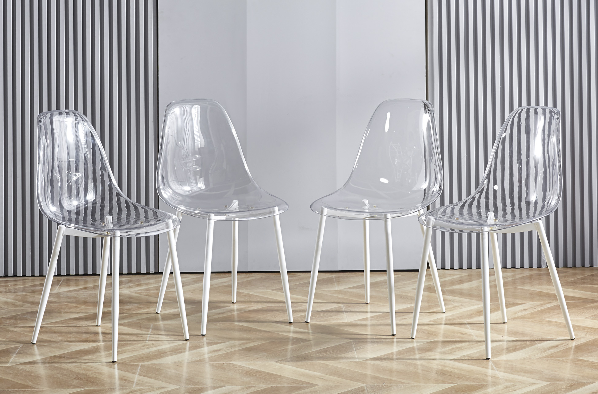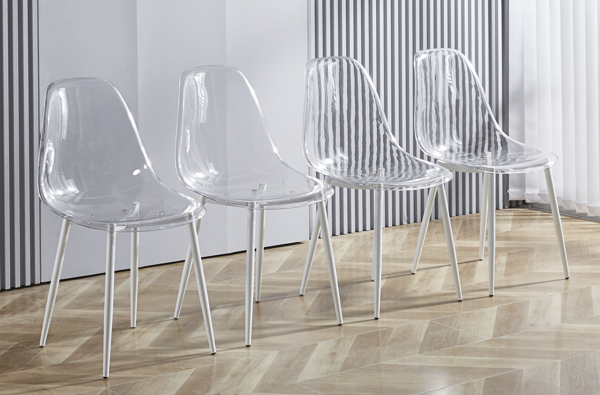 Carcasa de asiento y respaldo en PET transparente. Estructura de patas metálica en color blanco. Medidas: 46,5 x 50 x 85 cm.