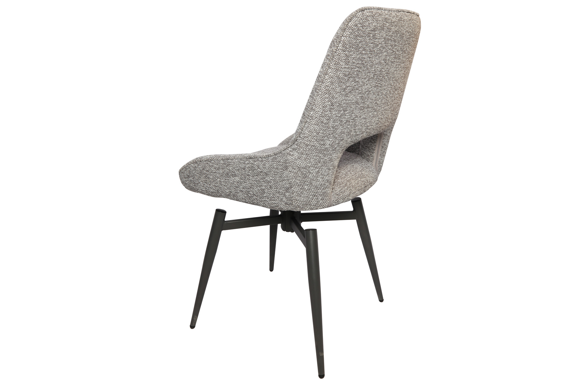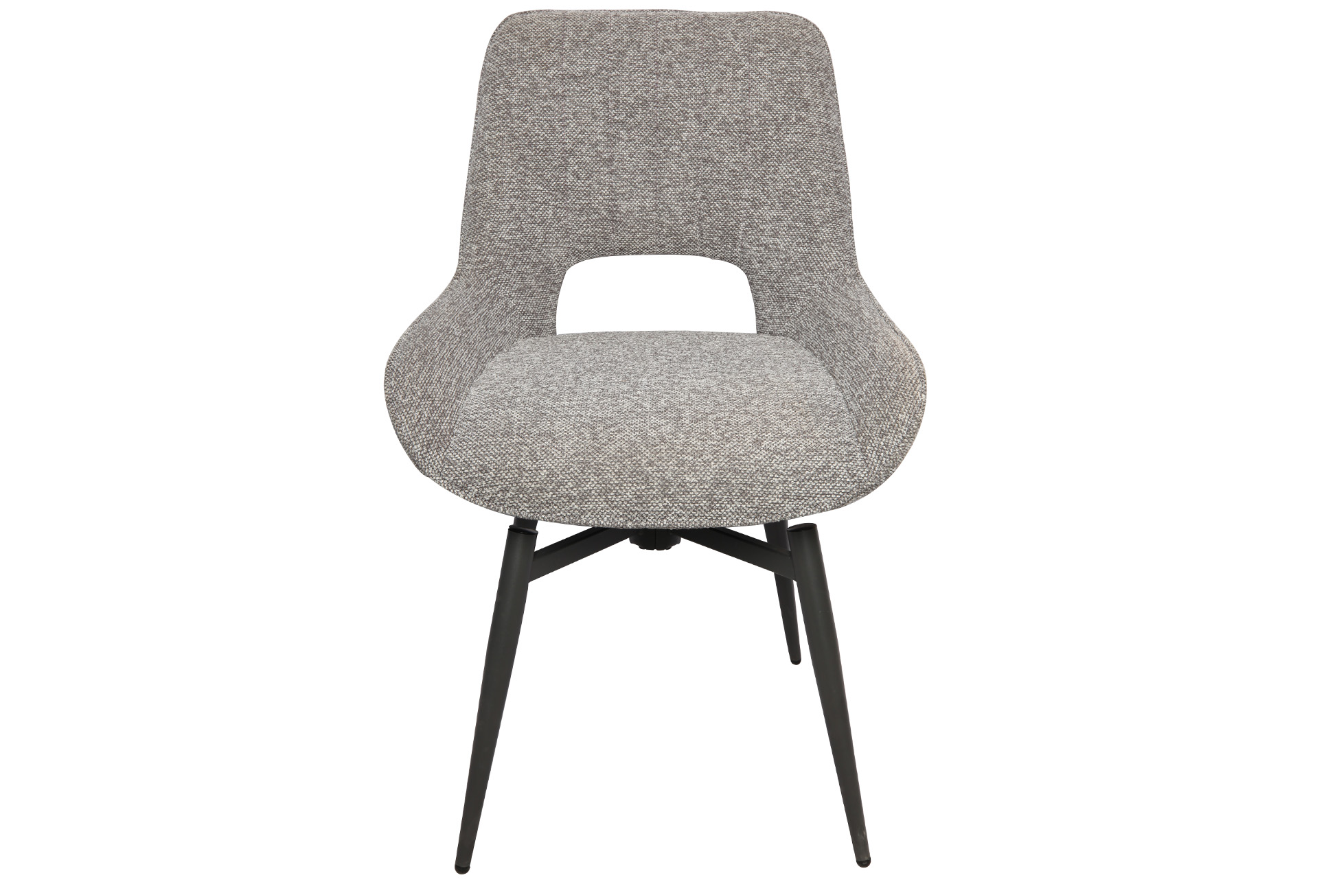 Silla comedor tapizada en tejido. Giratoria 180 grados. Función retorno a su posición. Patas metálicas color negro. Tejido gris. Medidas : 61x 54,5 x 88,5 cm.